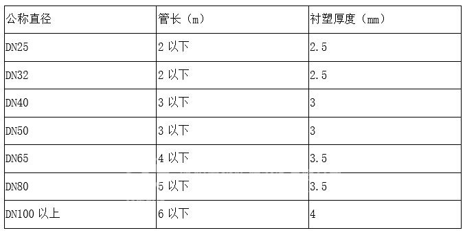 注:1.為保障管徑襯塑后符合工藝要求,DN65以下管道內(nèi)口徑應大于原設計6-10mm。